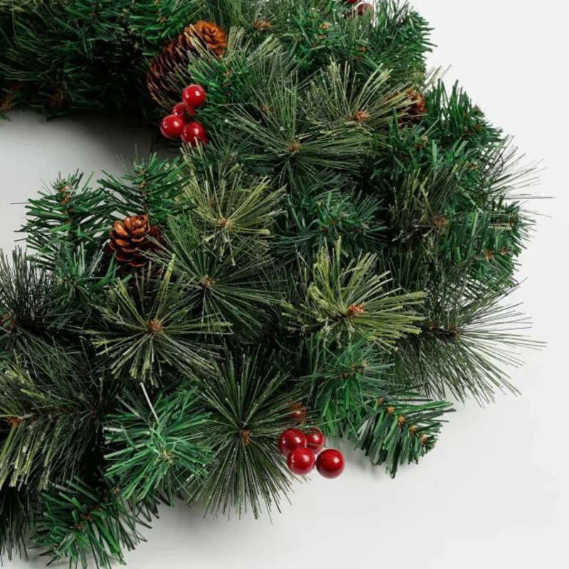 Dieser tolle Kranz ist eine stimmungsvolle Deko in der Vorweihnachtszeit. Der Weihnachtskranz ist vielseitig einsetzbar und kann als Tür-, Tisch- oder Fensterkranz verwendet werden. Die Tannenzapfen und roten Beeren verleihen dem Kunst-Tannenkranz eine besonders natürliche Optik. Dekorieren Sie den Kranz je nach Wunsch mit Weihnachtsschmuck oder einer Lichterkette und machen Sie ihn zum stimmungsvollen Highlight Ihrer Weihnachtsdeko!
